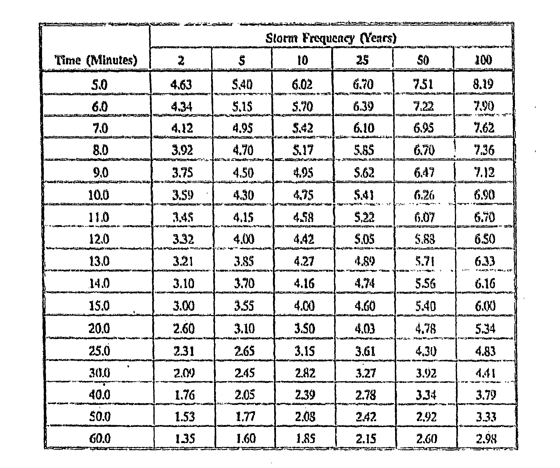 TABLE A-6 PennDOT REGION 5 PENNSYLVANIA RAINFALL INTENSITY-DURATION-FREQUENCY STORM DATA