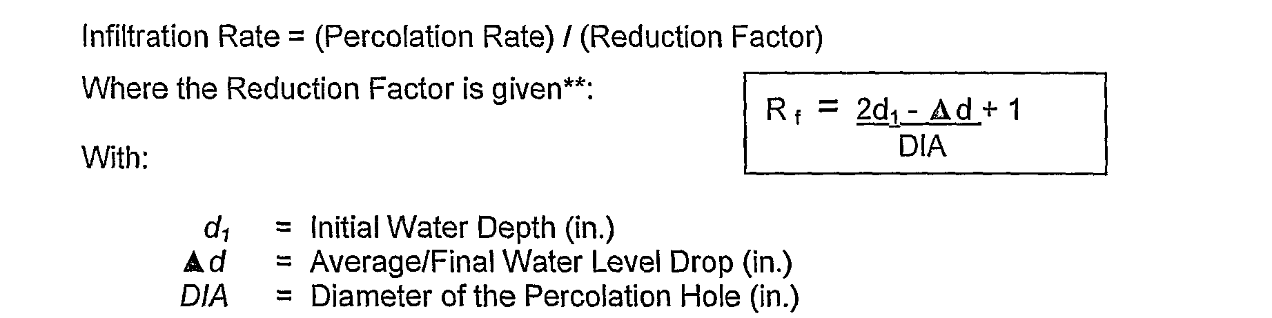 ** The area Reduction Factor accounts for the exfiltration occurring through the sides of percolation hole. It assumes that the percolation rate is affected by the depth of water in the hole and that the percolating surface of the hole is in uniform soil. If there are significant problems with either of these assumptions then other adjustments may be necessary.