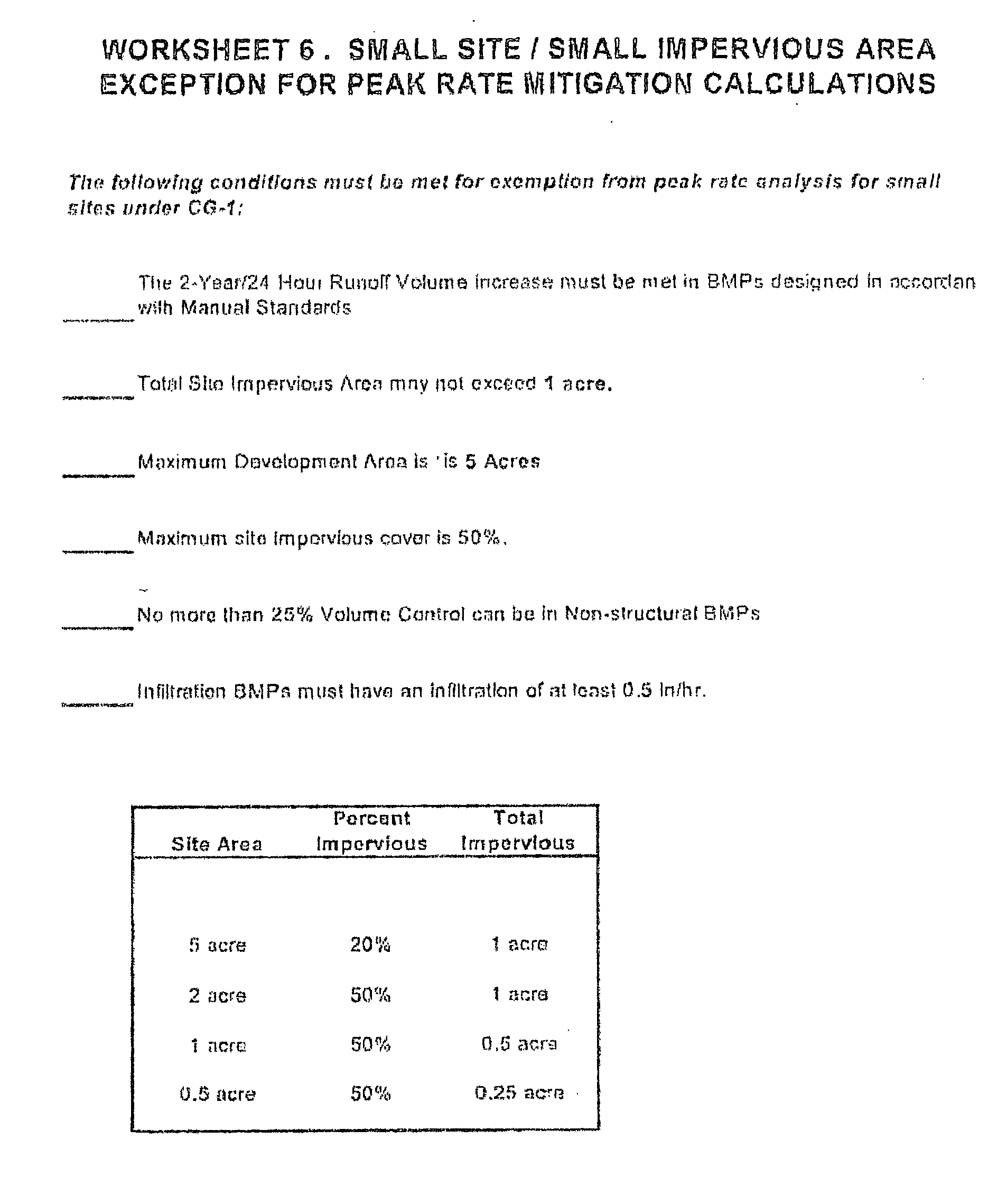 WORKSHEET 6. SMALL SITE / SMALL IMPERVIOUS AREA EXCEPTION FOR PEAK RATE MITIGATION CALCULATIONS
